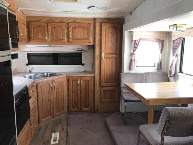 April 12, I bought a 5th wheel trailer. It’ something I’ve been thinking about to have for guests over the summer. This one seemed like a good deal. The kids and I have set about sprucing it up – removing window treatments and painting.
