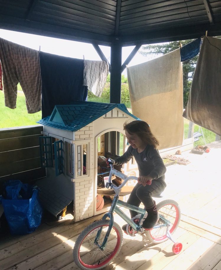 In the meantime, I turned the gazebo on the front deck into a temporary clothes line. The electric fence wires strung between the posts work quite well. The Saskatchewan wind is great at drying clothes. However, all the rain we’ve been having is making it hard to get much dry. The laundry was already backed up when the dryer quit. Now it’s an ever increasing mound that doesn’t seem to go down despite my best efforts. That tends to be the case even when there is a working dryer. It’s more pronounced without. Line drying is something I was wanting to do but there are things like jeans and towels that don’t do very well out there. Cora, however, is very proud that we’re doing things “the old fashioned way”. I suppose that’s good.