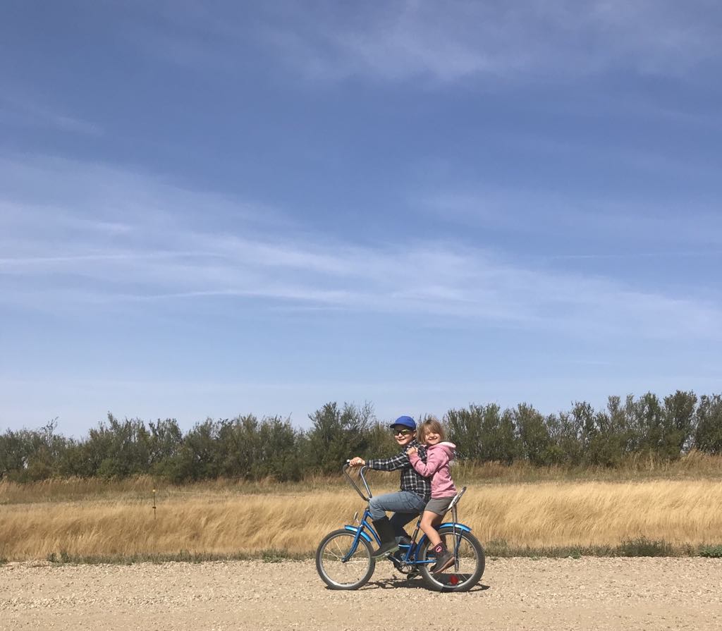 What I will remember most about this summer is the sight of Branch riding his new to him vintage bike with Cora behind him sharing the banana seat. They loop around from the driveway by the house, along the road, and back onto the driveway by the barn. The royal blue bike stands out in the backdrop of golden dormant grass and green shrubbery. They move with joy and confidence. I remember that – riding around with siblings piled on your bike – the feeling of freedom as you travel down the road propelled by the strength of your own body peddling. It was empowering. I remember it as I bike from the house to the barn to feed the sheep in the morning. I remember that this is what we’ve come here for.