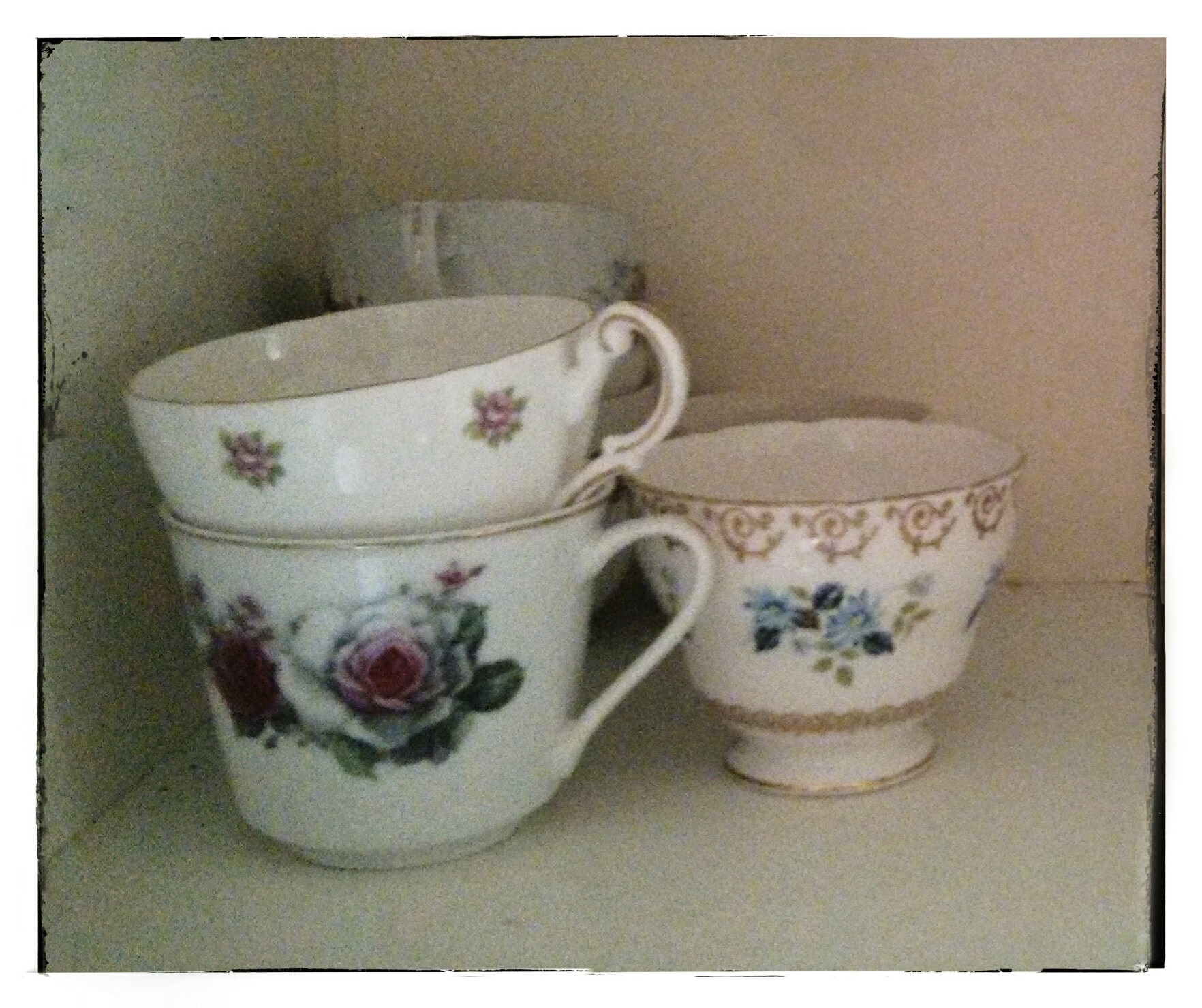 holes in the wall, I’ve been reorganizing and redecorating. Sometime ago a friend was overwhelmed by all my dishes. I have two complete formal sets and one partial along with three everyday sets. She suggested scaling back but at that point I wasn’t ready. Her encouraging words returned to me recently. So I let go of my everyday dishes and replaced them with a partial set of formal china. The array of glass cups gave way to assorted tea cups. That’s what I was serving juice in on a very disappointing Saturday morning.
